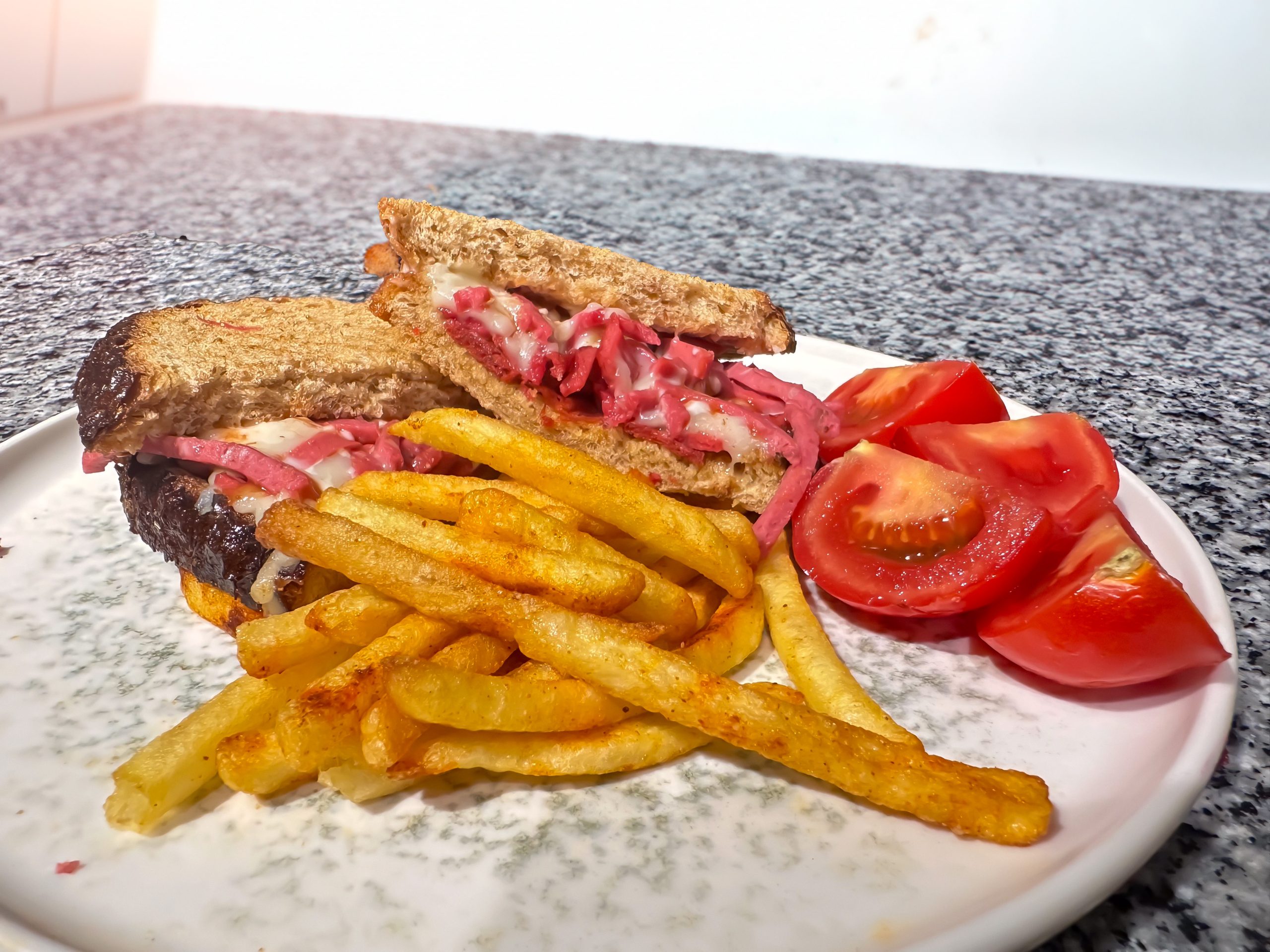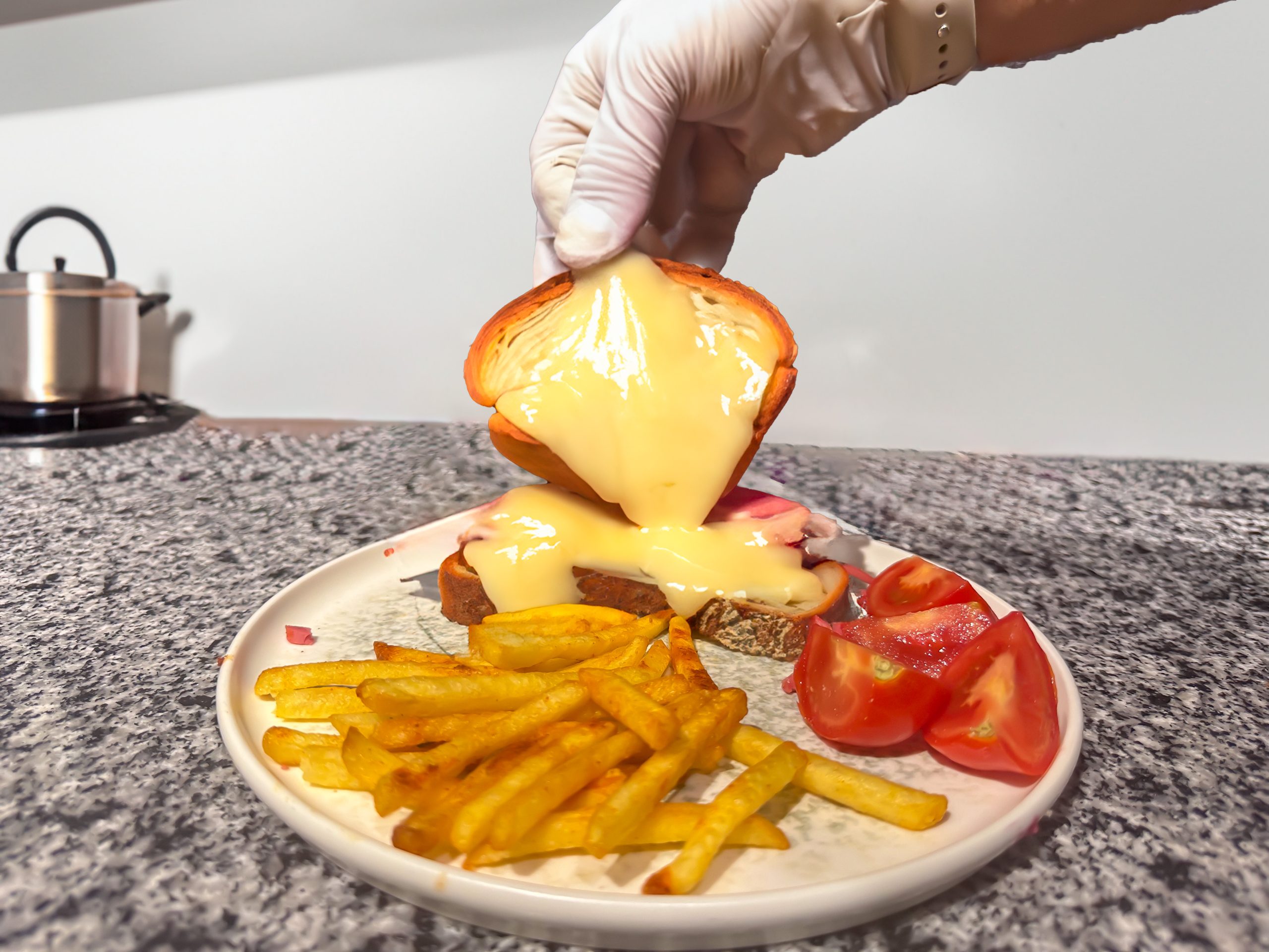 Sucuklu ve kaşarlı, yanında patates kızartması ve domates ile servis edilir.