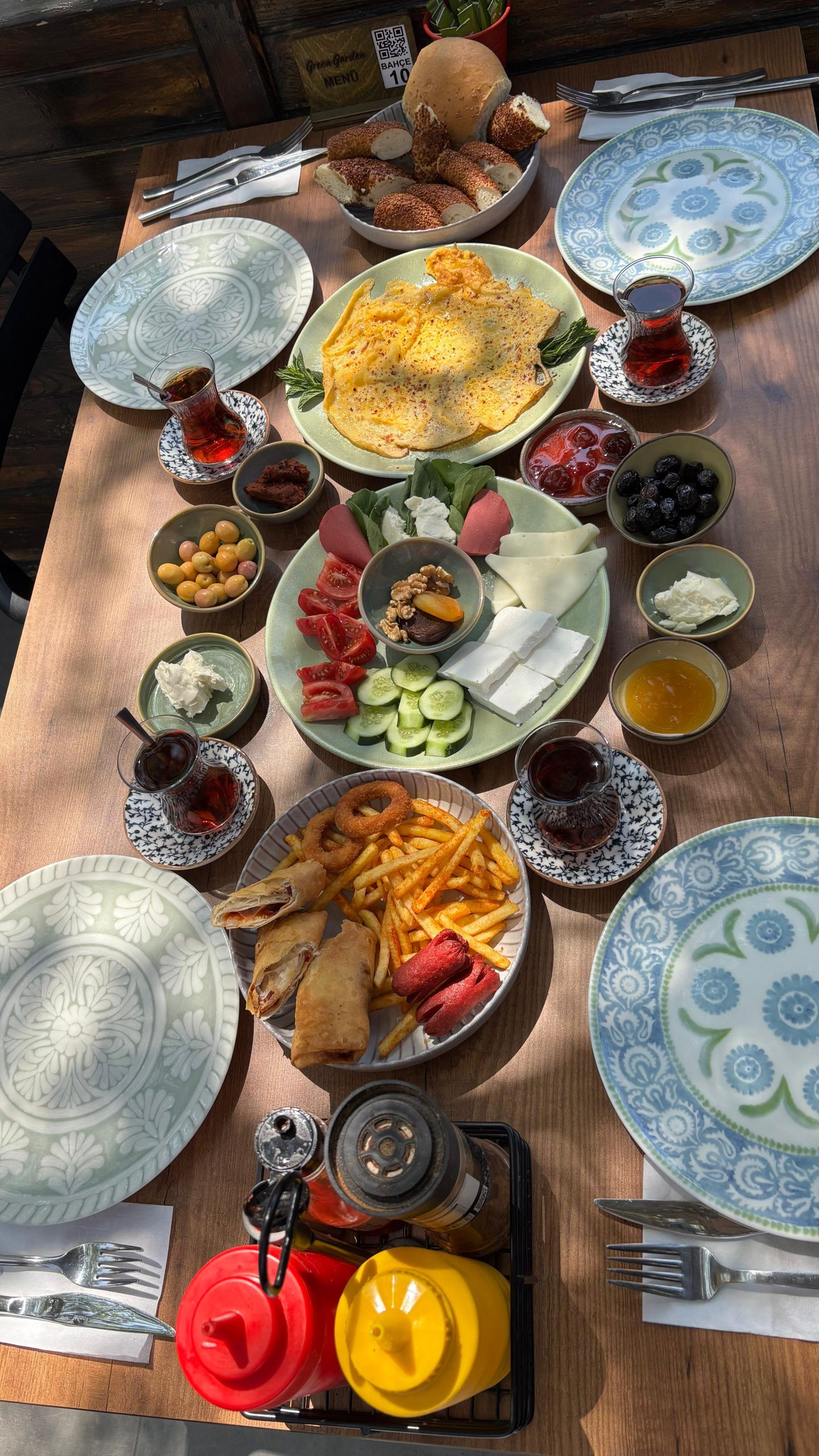 Salam, reçel, bal, tereyağı, iki çeşit peynir, zeytin, patates, domates, salatalık ve çay.